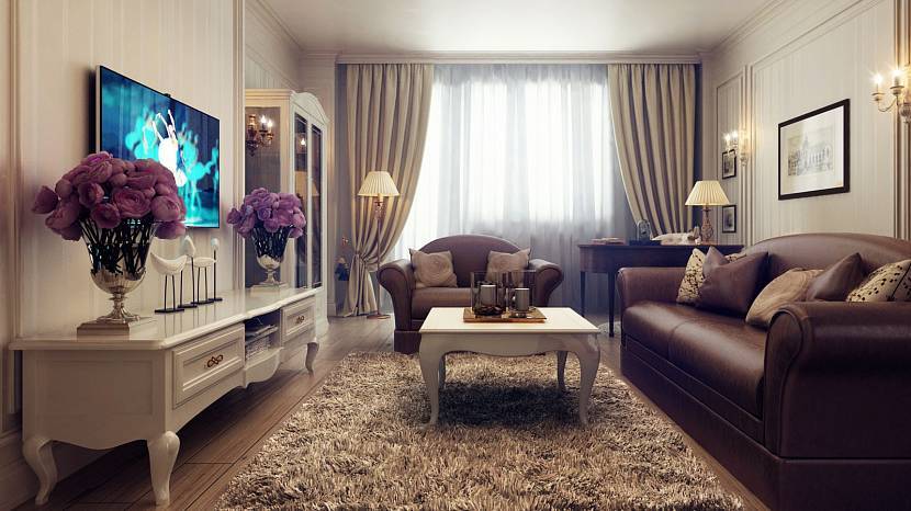 Минимальное количество мебели. Классика не предполагает использование громоздких стен, стеллажей, шкафов.