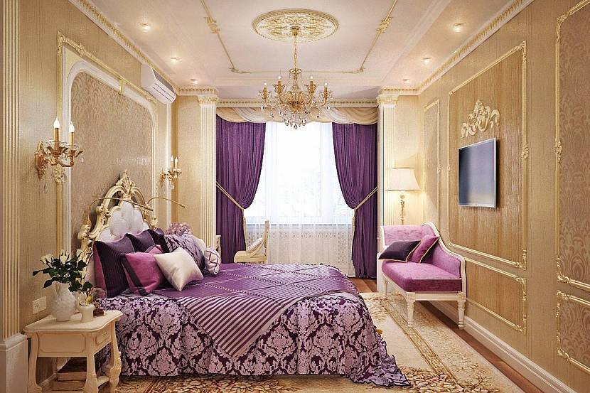 Роскошная спальня в классическом стиле добавлением лавандового и золотого цветаИсточник dg-home.ru