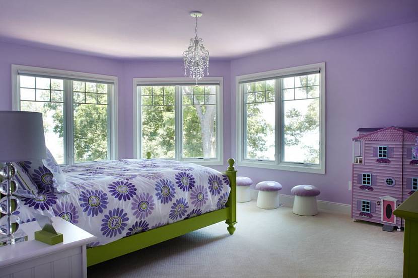 Нежно-сиреневые цвета превосходно дополнят территорию детства. Применяя правильные детали интерьера, вы сможете создать настоящую сказочную атмосферу! Лучше всего выбирать спокойную цветовую гамму – сочетать сиреневый с белым, жемчужным, кремовым. Выигрышно будут смотреться также цветочные узоры в сиреневом оттенке. Оттенить комнату можно аксессуарами ярко-бирюзового цвета. Она больше подойдет для маленьких принцесс, так как является альтернативой розовому.