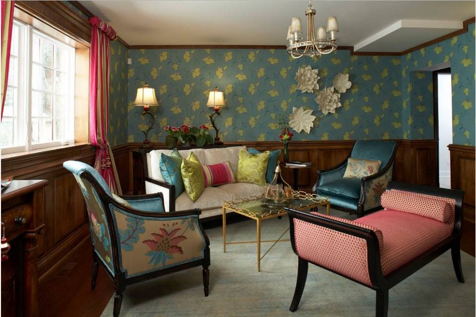 Оформив какую-либо стену, нишу или зону камина выразительными обоями в цветок, можно акцентировать внимание на отдельных участках комнаты.