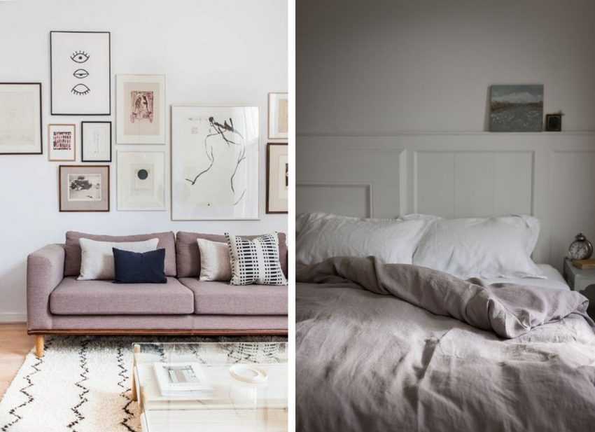 - Сиреневые стены плюс все оттенки белого в стиле сканди. Действительно, такая тема частенько эксплуатируется в скандинавском интерьере.
