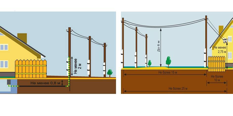 Подводка проводов может быть осуществлена как по воздуху – от столба к дому, так и под землей. Провод от столба электропередачи к дому не должен провисать больше, чем на 3.5 метра от земли. Он не должен касаться веток деревьев, деревянных частей дома, каких-либо других выступающих узлов. При расстоянии больше … метров от столба до входного узла в дом, нужно установить дополнительную опору для проводов.