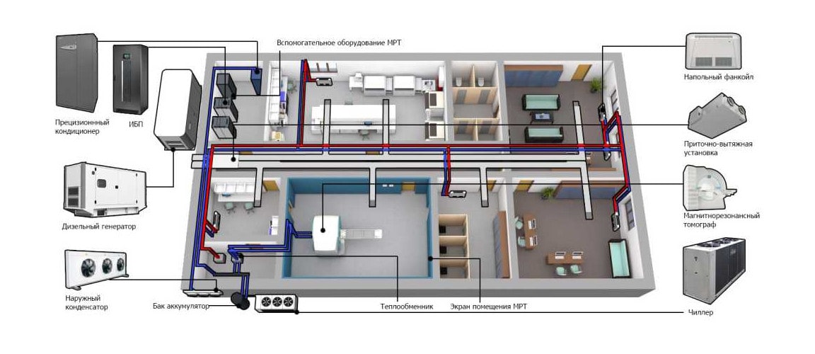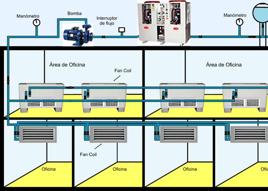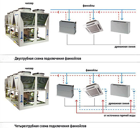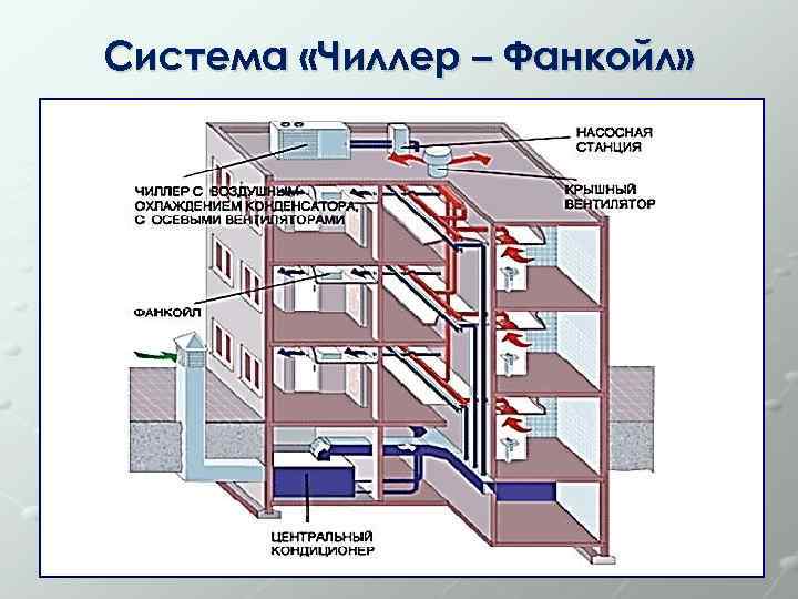 - За охлаждение жидкости или сохранение требуемой температуры жидкой среды отвечает чиллер. От него подготовленная жидкость по трубам поступает в фанкойл.