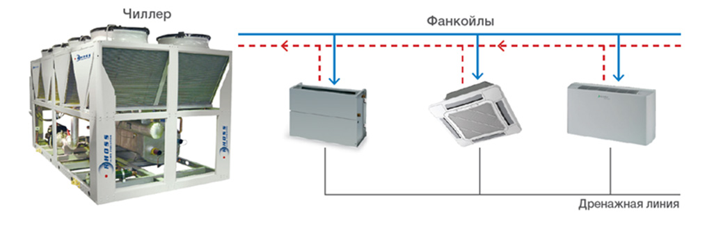 Ключевыми элементами схемы являются фанкойл, чиллер и гидромодуль. Чиллер и фанкойл объединяются друг с другом посредством трубопроводов, на гидромодуль – насосную станцию – возлагается задача создания циркулирующего потока жидкости.