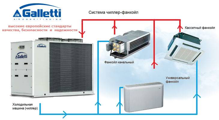 Работу внутреннего блока выполняет фанкойл. С его помощью осуществляется прием охлажденной жидкости и передача холода в помещение. После того как жидкость окончательно нагрелась, она передается обратно в чиллер. Фанкойлы устанавливаются в каждом помещении и работают по индивидуальной программе.