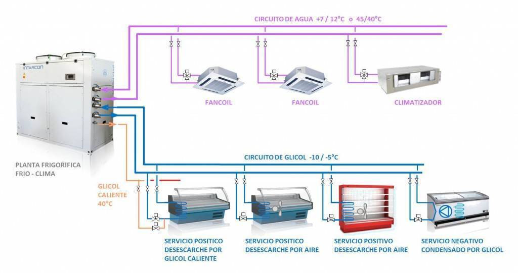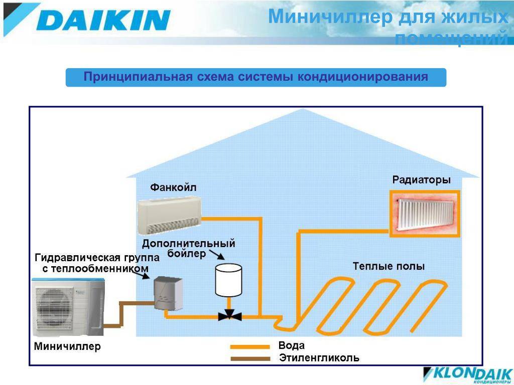 Устройством для охлаждения служит чиллер. Он представляет собой внешний блок, производящий и подающий холод по комплексу трубопроводов, внутри которых происходит циркуляция этиленгликоля или воды. В этом состоит принципиальное отличие от сплит-систем, где в качестве хладагента выступает фреон, передача которого осуществляется по дорогостоящим трубам из меди.
