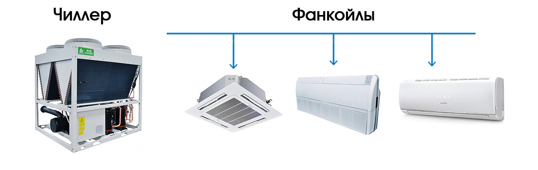 Главными составляющими элементами системы выступают чиллер, фанкойл и гидромодуль. Первые два агрегата соединены друг с другом трубопроводами, а насосная станция предназначена для циркуляции жидкости в трубах.
