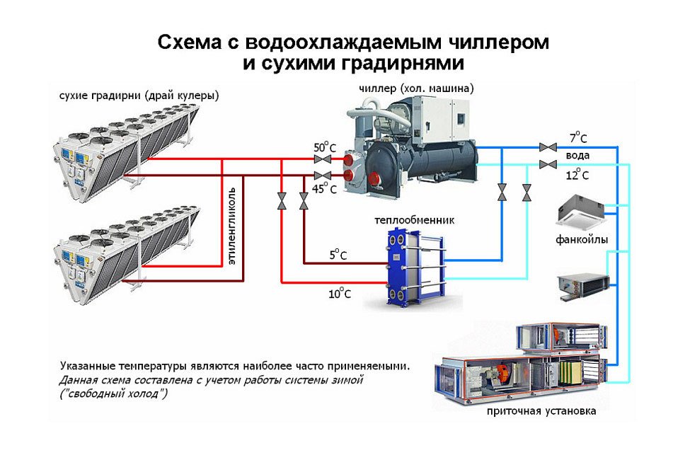 До 1982 года чиллер являлся единственной системой кондиционирования, которая могла обеспечить работу неограниченного числа помещений. Соответственно схем подключения чиллера и его работы на различных объектах тоже немало. Отсюда как самих конструктивных решений холодильных машин, так и вариантов их подключения большое множество. Самая распространенная схема: чиллер с воздушным конденсатором, который обдувается осевым вентилятором, водяным контуром и двумя насосами в гидромодуле. В случае расположения чиллера в теплом помещении возможна схема с выносным воздушным конденсатором, который не входит в комплект поставки и приобретается отдельно. В этом случае есть неудобства, связанные с ограничением длины трубопроводов и взаимного расположения самого чиллера и выносного конденсатора. Есть схемы с водяным конденсатором, когда можно расположить сам чиллер в теплом помещении, удобном для обслуживания. Однако для снабжения конденсатора холодной водой необходим дополнительный водяной контур с сухой градирней (драйкулером).