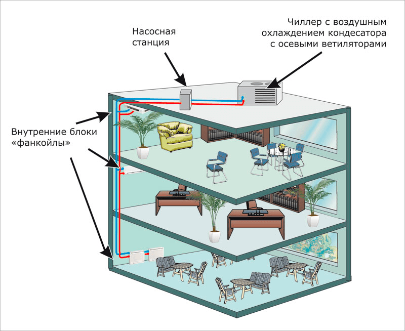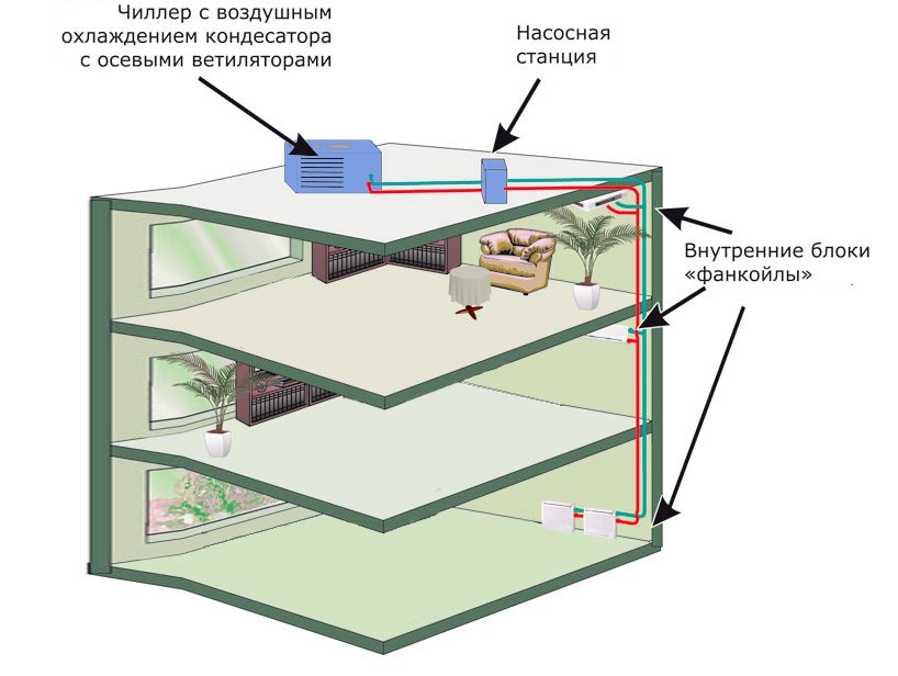 Системы типа «чиллер-фанкойл» используют для кондиционирования воздуха в больших зданиях, но они находят применение в частных домах, коттеджах и даже просторных квартирах