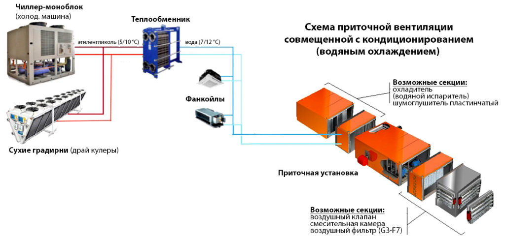 Изначально чиллеры использовали для охлаждения, в первую очередь, воды. Далее вода поступала либо в фанкойлы для охлаждения воздуха в помещении, либо на другие нужды.