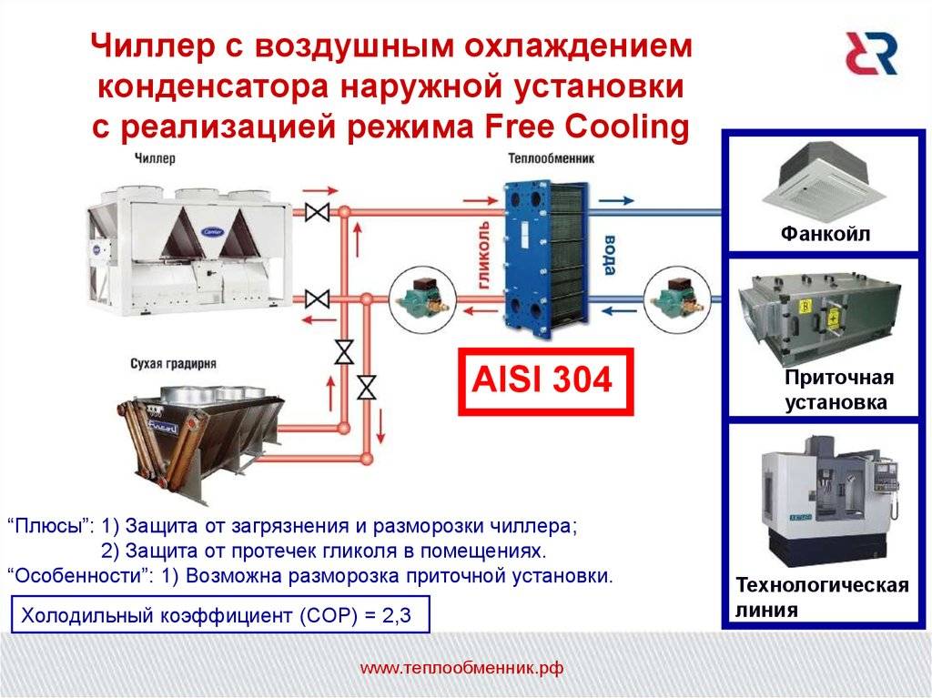 Помимо этого имеются чиллеры в специальном исполнении, работающие также в режиме нагрева жидкости. Обычно такой режим называют – режим работы теплового насоса или просто тепловой насос. Это направление уходит немного в сторону от системы кондиционирования и занимает отдельную нишу – тепловых насосов. Чиллер, работающий и на охлаждение, и на тепло, называется – чиллер с функцией теплового насоса.