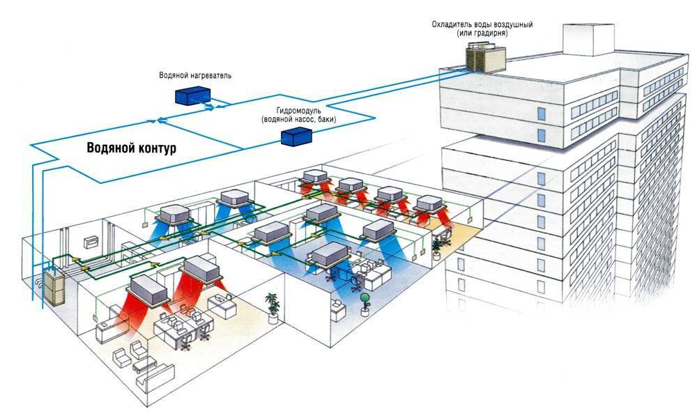 Холодная вода возвращается в фанкойлы. Там, благодаря радиаторам, она охлаждает воздух. Если рассматривать второй режим — обогрев, то работа (циркуляция) происходит в обратном порядке. В этом случае в фанкойлы попадает теплая жидкость, которая нагревает воздух в помещении.