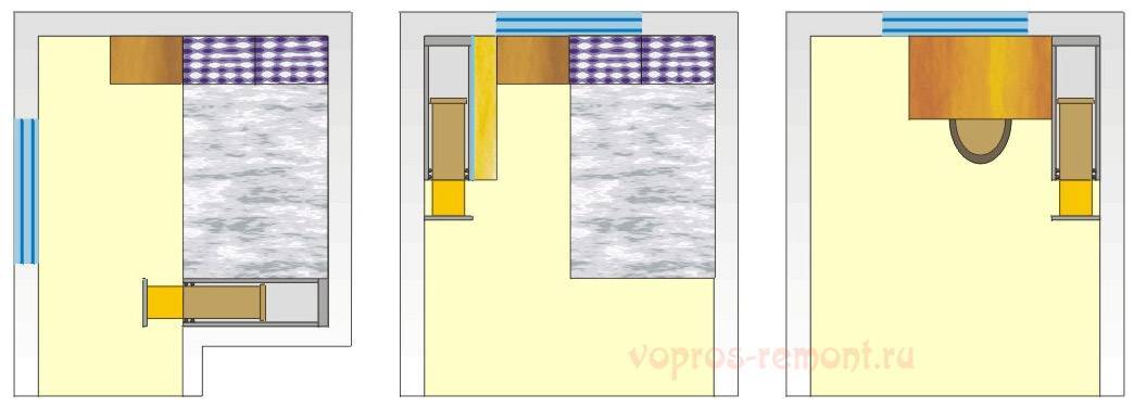 Реализованные на сегодняшний день варианты установки пенала показаны на следующем рис. Слева – в спальной нише. Длину кроватных ниш в однушках проектировщики дают с запасом, и получается закоулок-мусоросборник. Чаще всего жильцы оставляют его у изголовья, ставя туда столик или тумбочку с выдвигающимися сбоку ящиками.