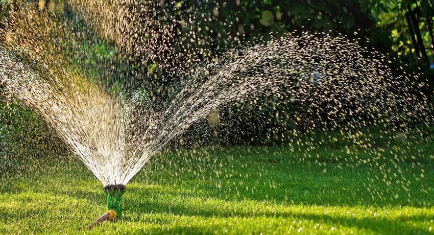 Спринклерная система полива подходит для полива газона или насаждений небольшой высоты — до 10-15 см