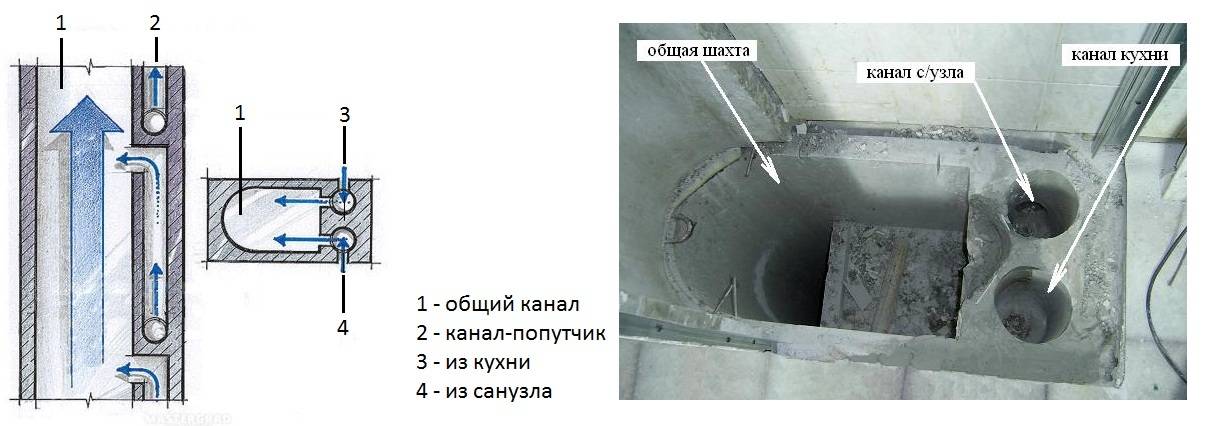 - Вентиляция с каналами спутниками при которой вентиляционная ветка от каждой квартиры подсоединяется к общему вентиляционному стволу.