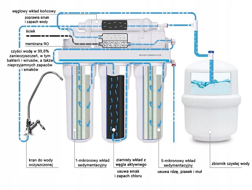 Реализована пятиступенчатая система очистки. Состоит из двух фильтров механической очистки, картриджа химочистки, мембранного и постфильтра. Комплектация включает кран, соединительные шланги, крепеж, уплотнители. Емкость накопительного бака 12 л. Устанавливается отдельно. Удовлетворяет суточную потребность в питьевой воде семьи из 4-5 человек.