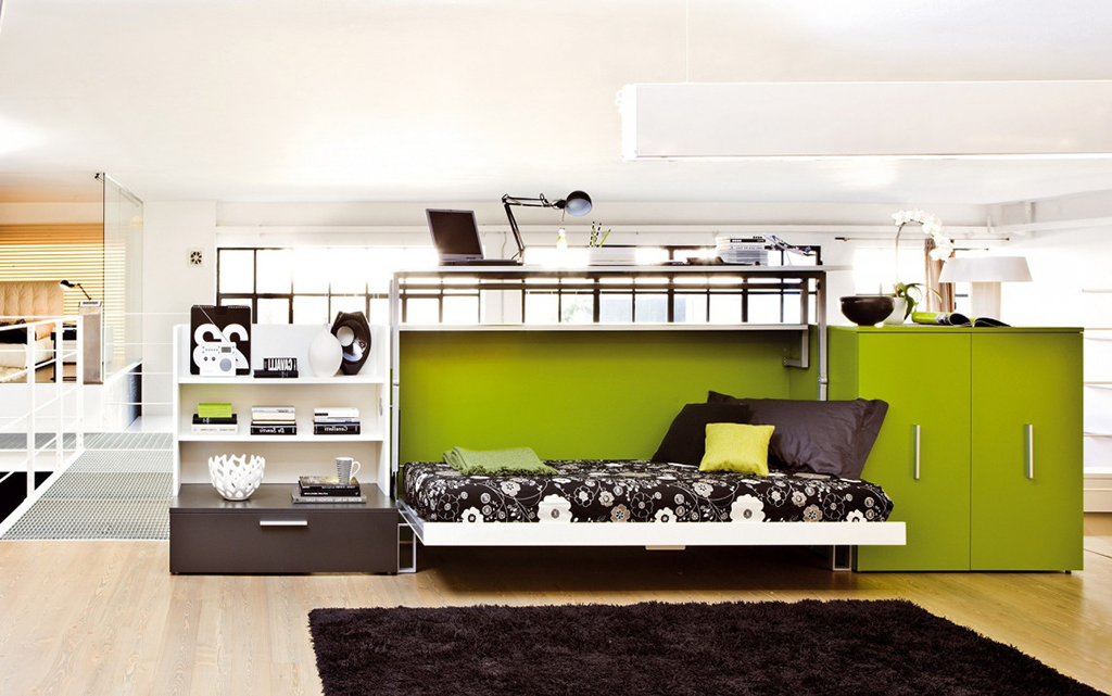 Для студийных помещений разработан идеальный вариант трансформера, закамуфлированного под закрытые полки. Встречаются модели односпальной кровати, превращающиеся в комод или стол.