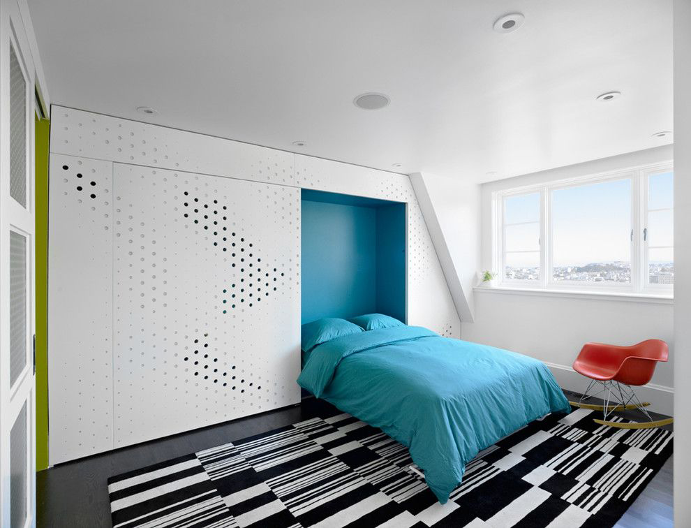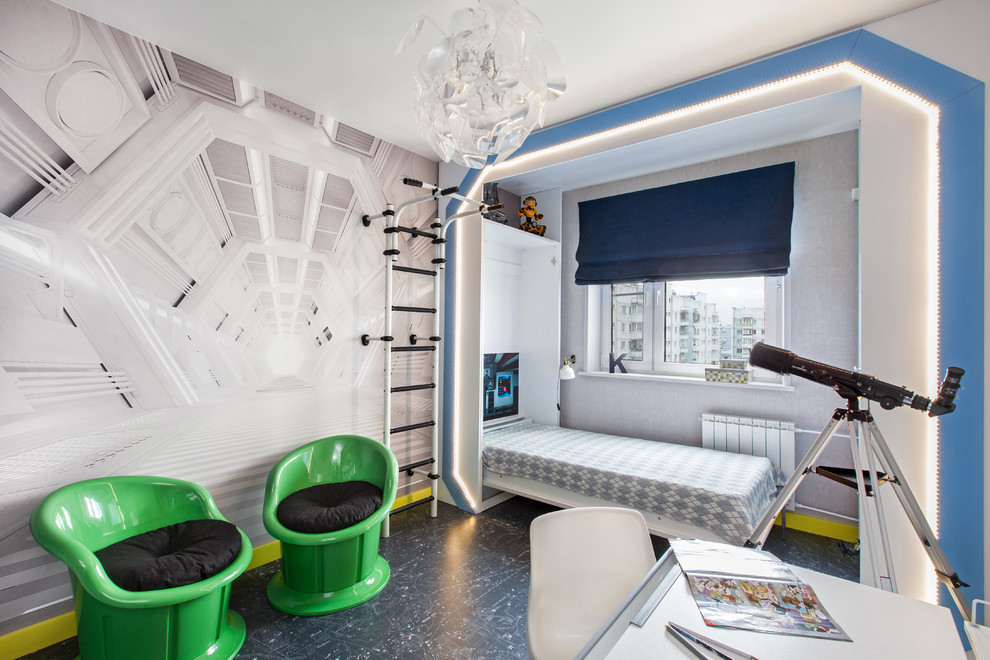 Интересные модели спроектированы для детских в стиле минимализм. Вжатая в стену кровать освобождает пространство, используемое в дневное время и как рабочее место подростка, и как спортплощадку, и как зону общения со сверстниками.