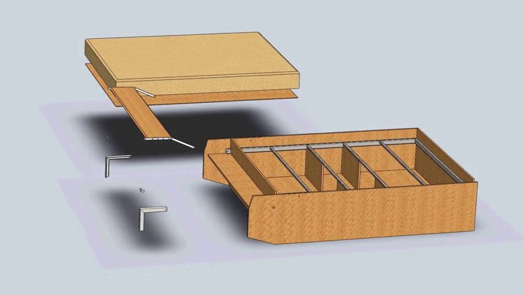 Сначала проводят сборку короба, похожего внешне на конструкцию напольного шкафа. Чтобы щит для ложа не прогибался, стоит укрепить его с помощью 5 досок. Они настилаются вдоль и поперёк будущей меблировки.