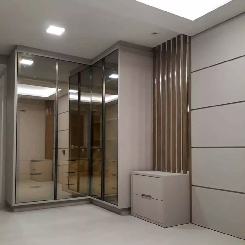 Угловое расположение шкафов-купе пользуется большой популярностью. Преимущества угловых моделей, как и встроенных заключается в их эргономичности.