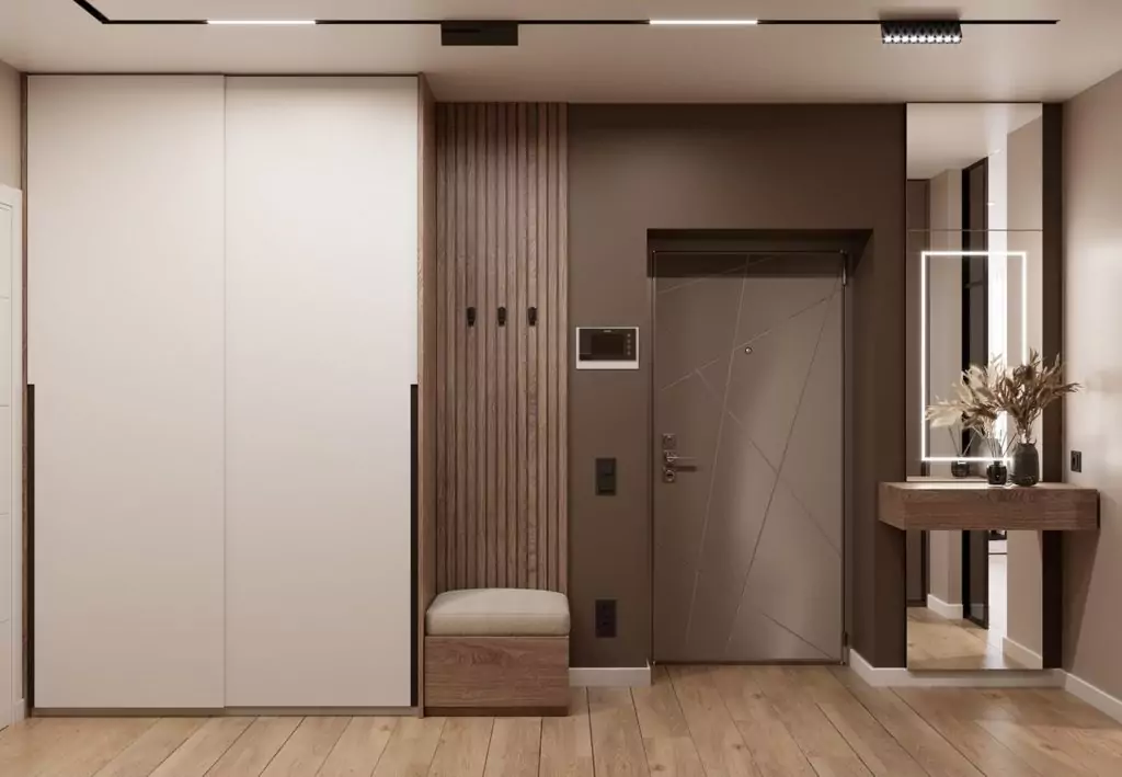Встроенная конструкция располагается в специальной нише в прихожей и занимает минимум свободного места. Такой вариант идеально подходит для небольшой прихожей из-за малых габаритов, ввиду отсутствия задней и боковой стенки. Если у встроенной конструкции будут раздвижные двери, то она будет смотреться монолитной.