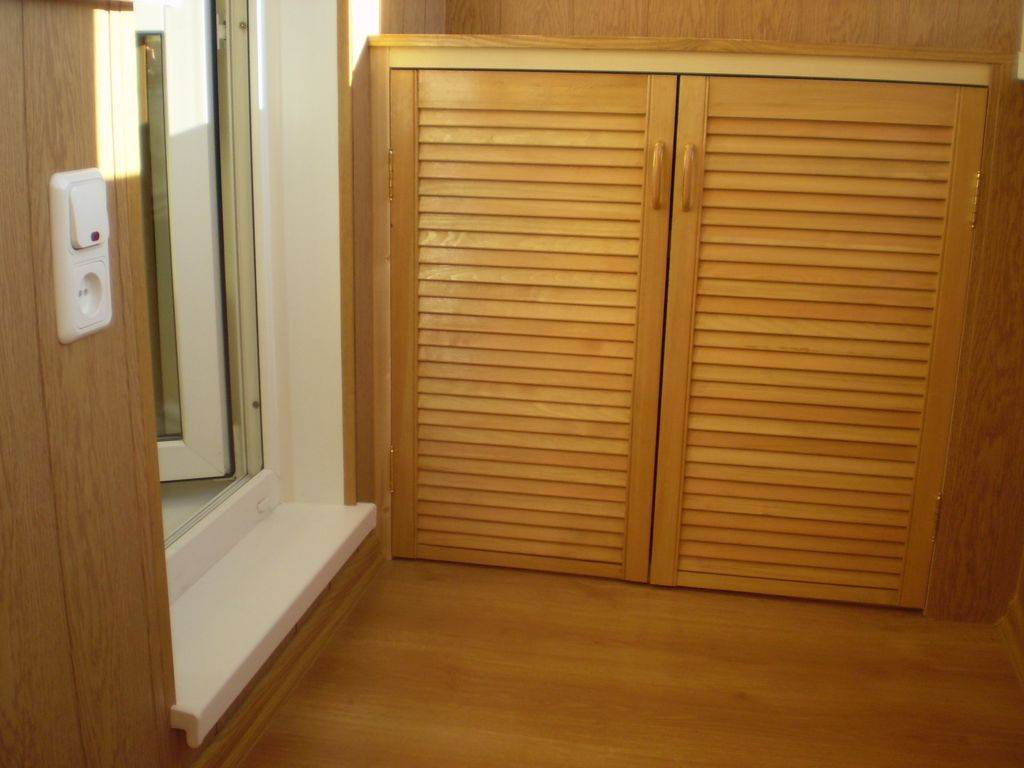 | 3 | Для дверной основы применяется обшивка из вагонки или пластиковых панелей. Если балконное помещение отделано тем же материалом, то шкаф впишется идеально. Основа для дверей делается из брусков толщиной не менее 12 мм.