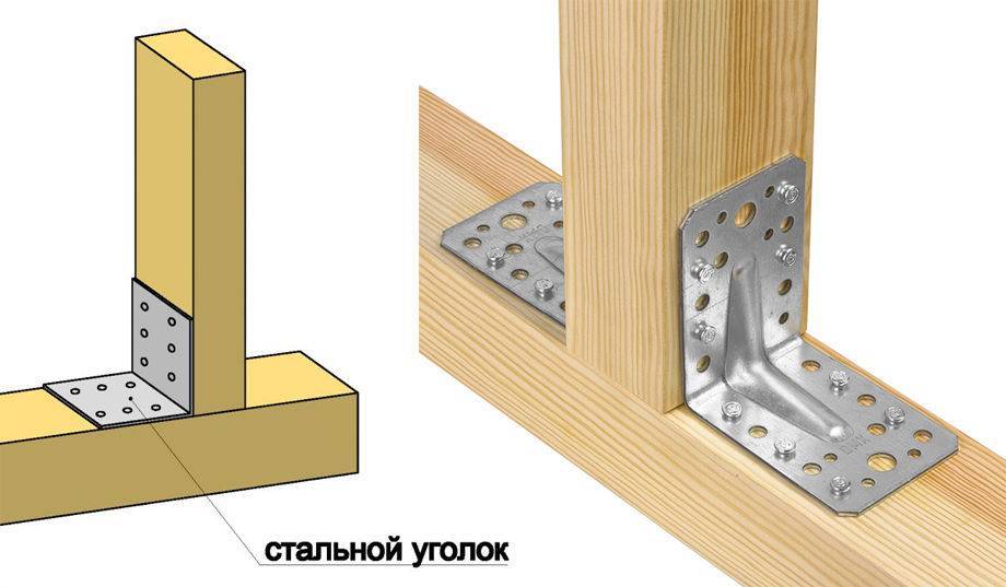 | 4 | Горизонтальные брусы соединить с вертикальными стояками уголками из металла с помощью саморезов. Уголки лучше устанавливать снизу бруса, чтобы их не было видно.