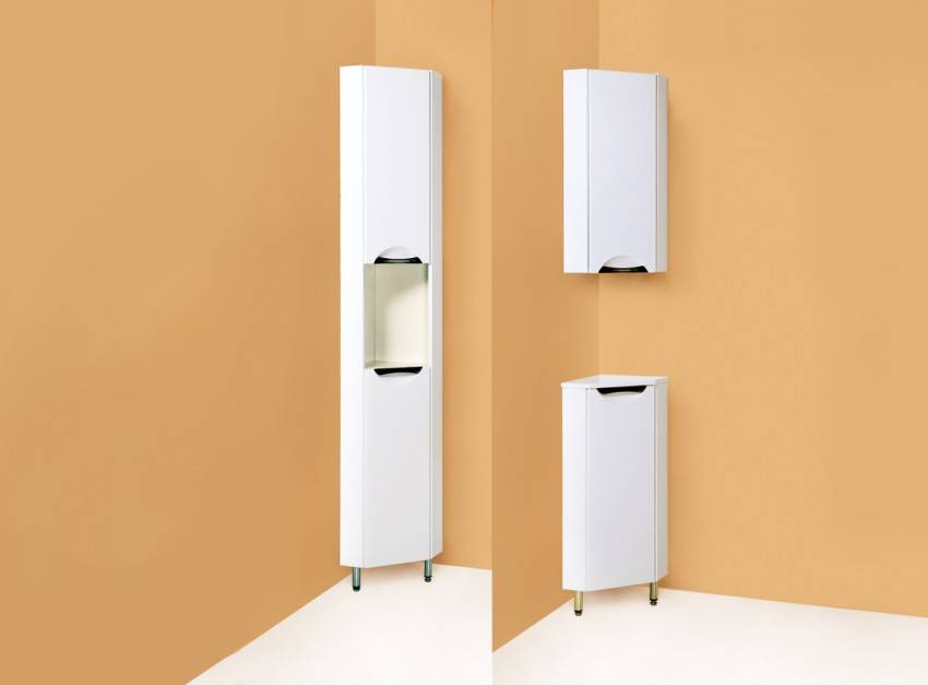 - Угловой пенал. Дополнительное преимущество этого вида шкафа заключается в том, что он делает полезным пространство, которое обычно никак не задействовано в помещении. Угловой пенал для ванной комнаты – это оригинальная возможность разместить много предметов на небольшой площади, не загромождая помещения.