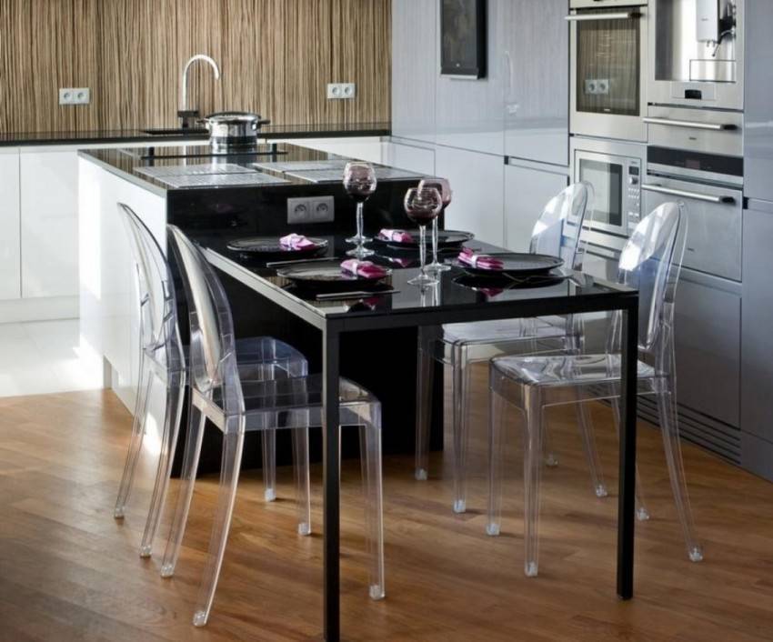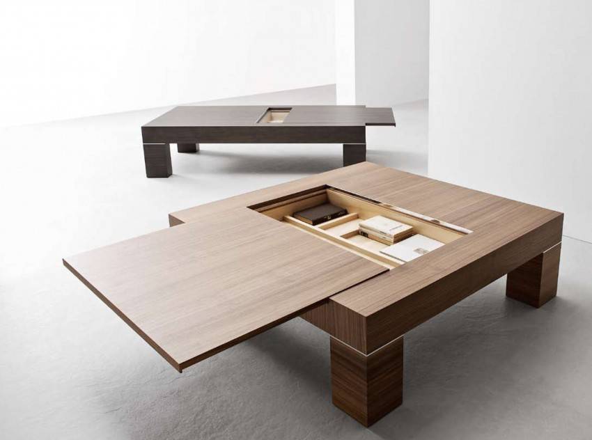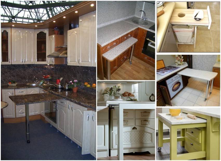 При выборе столов владельцы нередко отдают предпочтение функциональным, компактным модификациям, например, вариантам с откидными или раскладными столешницами.