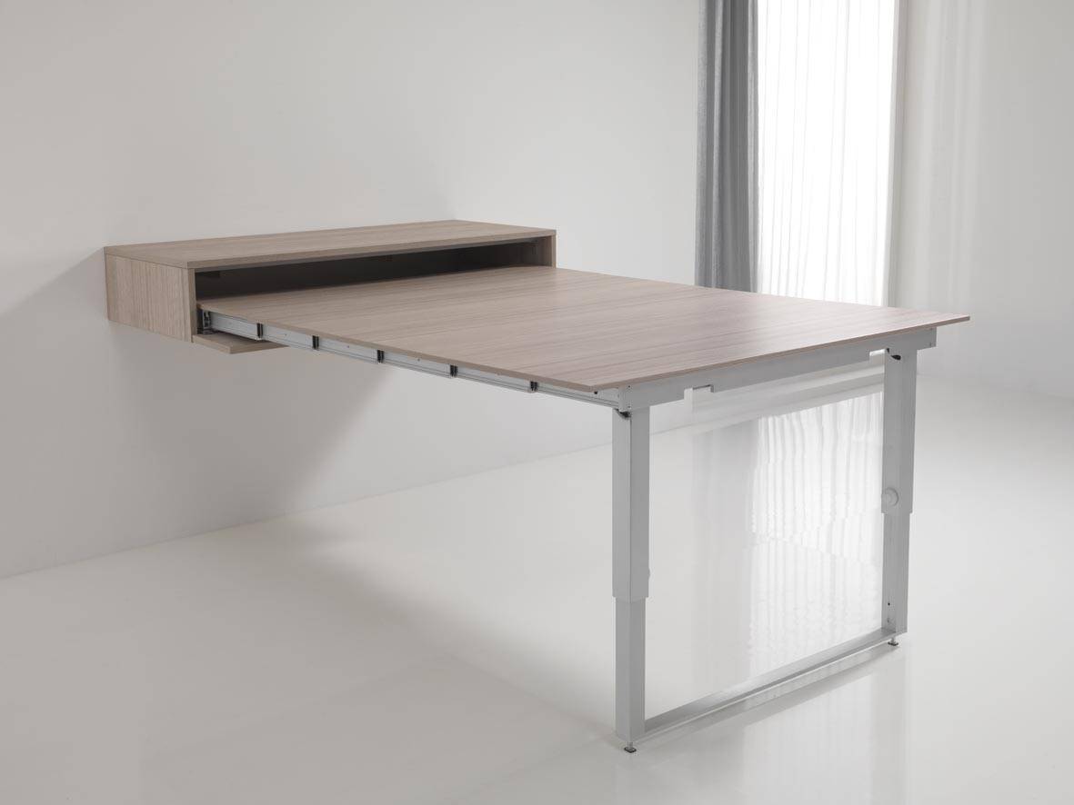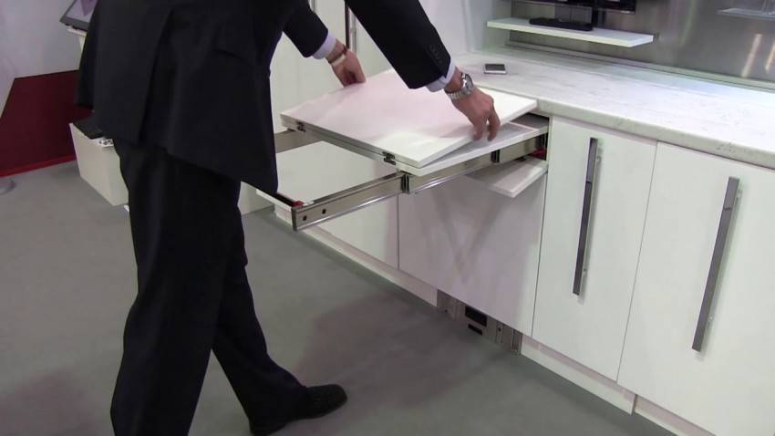 Все передвижные модели откидных столов, легко перемещаются вдоль стены, на которой закреплены, при помощи направляющих, находящихся снизу. Это компактное изделие, подходящее как для тесной, так и просторной кухни.