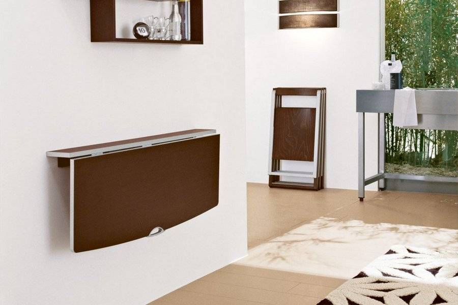 Складывающийся стол «трансформер» многофункционален. Он выполняется в двух вариантах: настенный (закрепляемый непосредственно на стене), пристенный (поверхность стола складывается от центральной оси в две стороны, изделие легко отодвигается, убирается в угол). В сложенном виде столик допустимо использовать в качестве тумбочки.