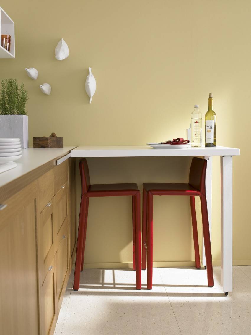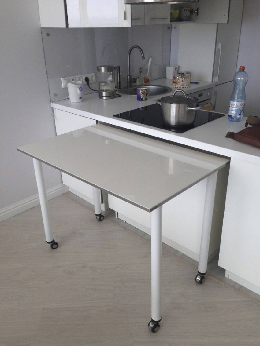 Выдвижная или откидная столешница является еще и очень удобным вариантом для узкой кухни. Она позволяет максимально эффективно использовать все пространство. Каждый, кто любит готовить, мечтает о большом рабочем месте, но это не всегда возможно в условиях наших квартир. Однако стол-трансформер всегда выручит, предоставляя дополнительную рабочую поверхность. А затем его легко очистить и убрать.
