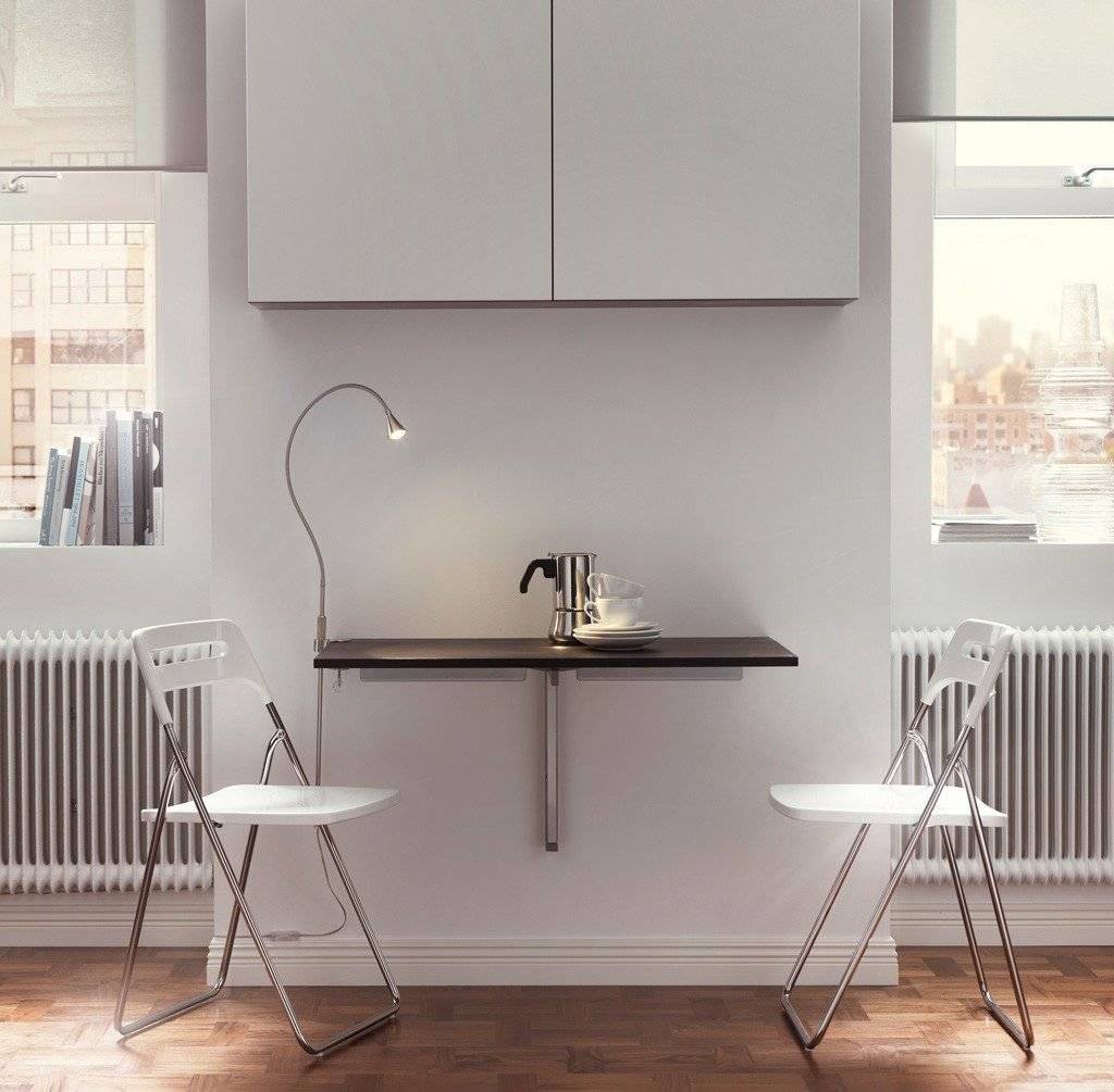 Самые миниатюрные конструкции представляют собой широкую полку, за более крупными откидными столами разместится одновременно три-четыре человека. Отдельные модели полностью лишены ножек, что позволяет им занимать минимум пространства, у других их одна или две. При выборе места установки учитывают имеющийся функционал, дизайн, габариты, высоту стула, близко расположенных предметов.