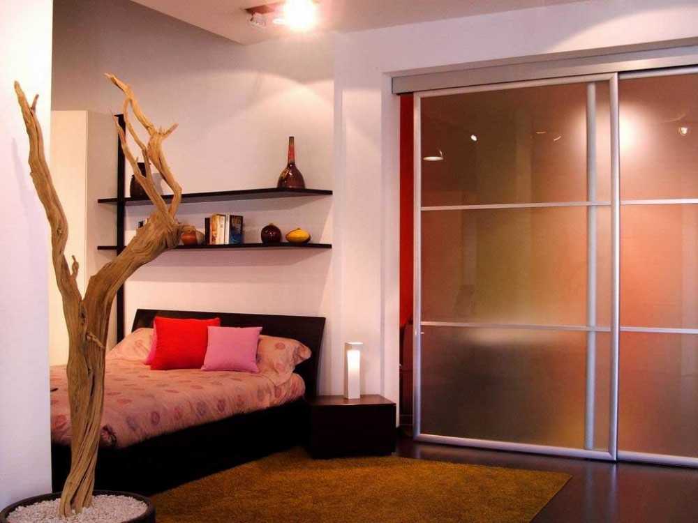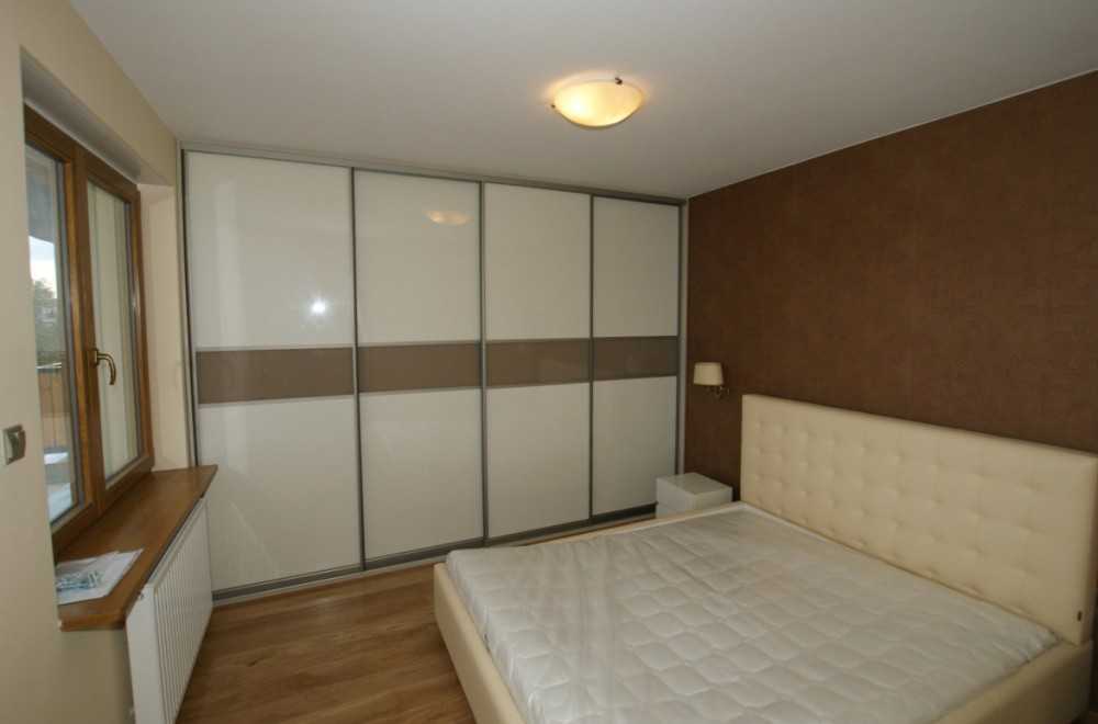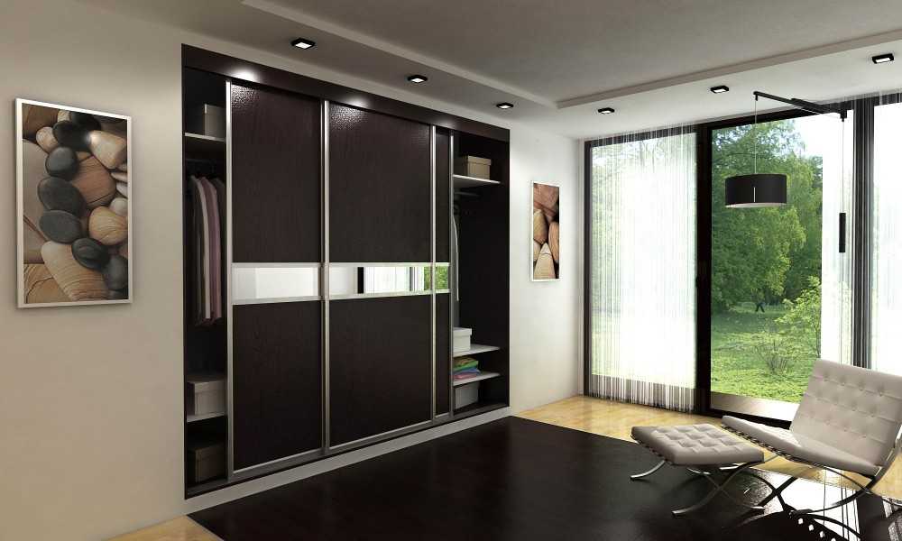 Наличие готовой ниши предопределяет место, выделяемое под гардероб, в то же время следует рассмотреть вариант встраиваемого по всей стене шкафа, который визуально изменит размеры комнаты за счет отражающей поверхности, или превращения прямоугольно вытянутой площади в квадрат. Такие гардеробы могут быть нестандартно узкими, притом вместительность обеспечивается за счет ширины и высоты отсеков.