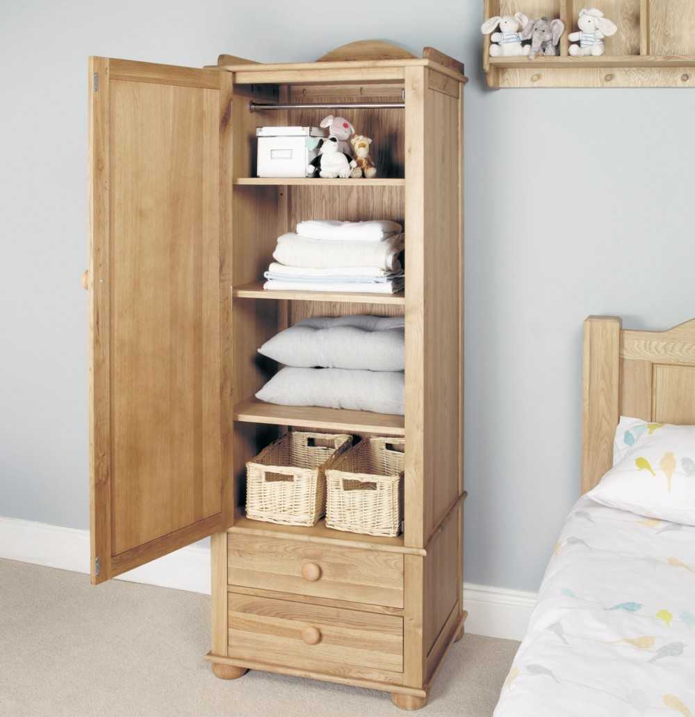 - Отдельностоящие. Самая распространенная модель. Основное преимущество — мобильность, при необходимости гардероб легко передвигается в любой угол комнаты. Стоит учитывать, что такие шкафы, как правило, довольно крупные, поэтому для маленьких помещений они не подходят. Их минимальная высота — 180 см, ширина — 80 см, глубина — от 46 см. В большинстве случаев изделия оснащены 2 створками. Внутри имеют несколько полок, 1 штангу. Такие шкафы для детей нередко дополняют угловыми полками или выдвижными ящиками. Минусы: скапливается пыль сверху мебели и за ней, более высокая стоимость, чем у встроенных конструкций.