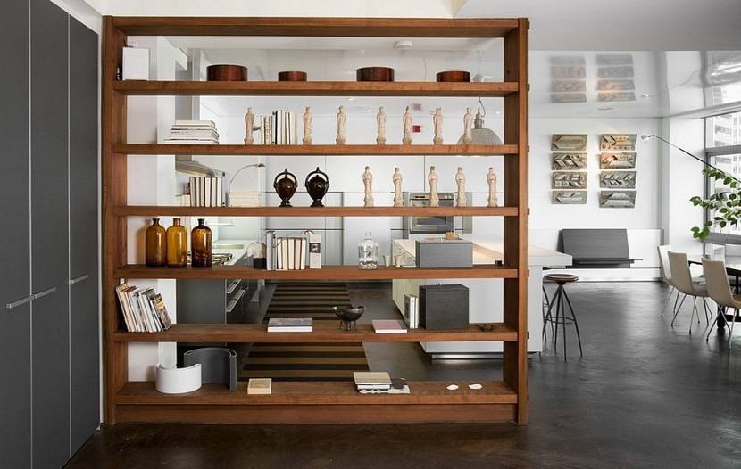 В интерьер кухни-гостиной или кухни-столовой гармонично впишется шкаф или стеллаж. Такая перегородка станет удобным местом для хранения кухонных принадлежностей.