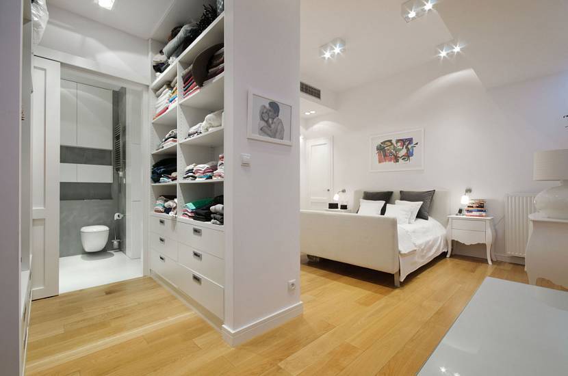 Вариантов размещения перегородки в комнате много, всё зависит от площади комнаты и разновидности конструкции. Объемные шкафы на всю стену больше подойдут для просторных помещений, небольшие стеллажи можно устанавливать в маленьких комнатах или квартирах-студиях.