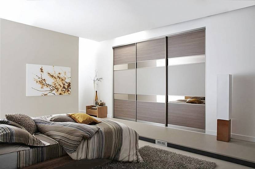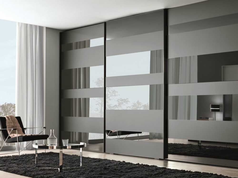 Стекло и зеркало – это популярный материал для створок гардероба. Чтобы отражающая поверхность не мешала сну, дизайнеры рекомендуют выбирать комбинированные модели из глянцевых и матовых полосок. Эффектно смотрится пескоструйное изображение, которое внешне напоминает изморозь и превращает дверцы в замороженные окна.