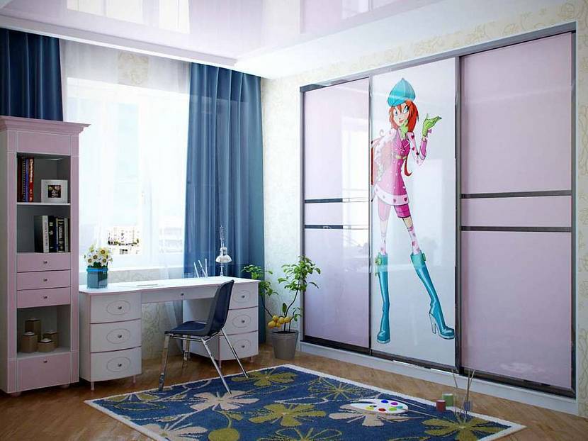 На панелях гардероба актуальны изображения любимых персонажей или сюжеты из сказок. В помещении запрещены стеклянные и зеркальные фасады, отдают предпочтение практичному пластику и безопасной древесине. Мебель перекликается с рисунками, оттенками на стенах, становится гармоничным продолжением пространства.