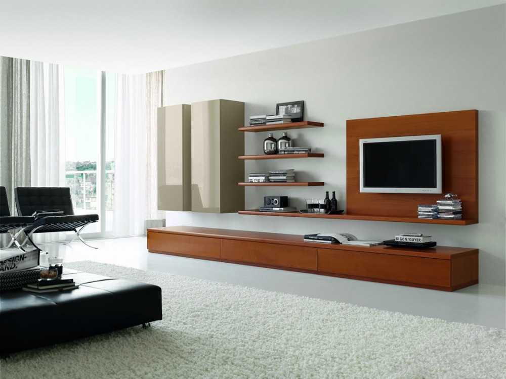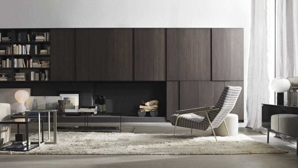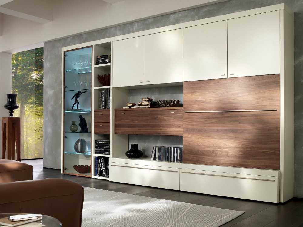 Модерн. Используется при создании систем хранения, подходящих городскому жителю. Характеризуется наличием в конструкции стекла, глянцевых панелей и обладает незатейливыми силуэтами. Благодаря этому не создаётся «давящего» эффекта и интерьер выглядит просто.