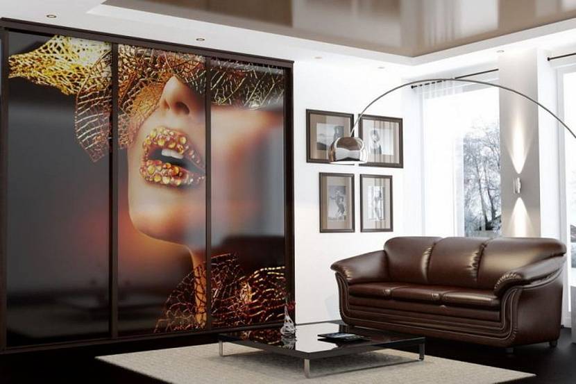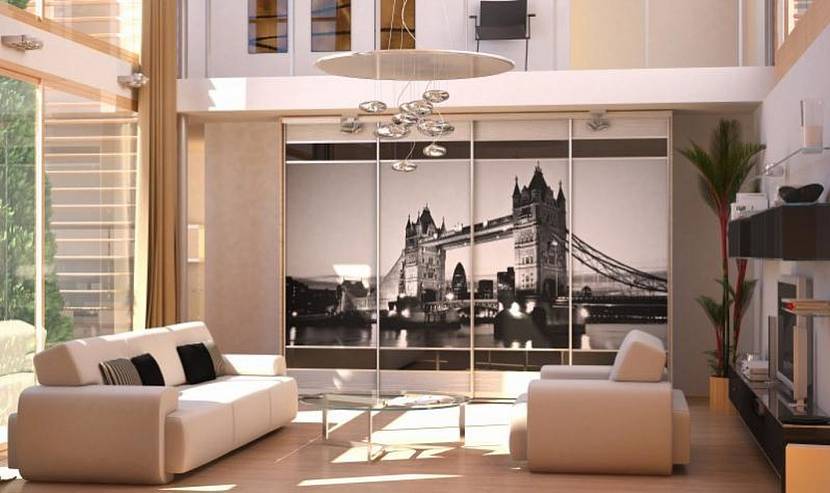 В гостиной запоминающейся деталью станет фотопечать на дверцах шкафа. Монохромное изображение узнаваемой достопримечательности выглядит удачнее цветных аналогов. На створках актуальны авторские рисунки, триптихи и одиночные картины.