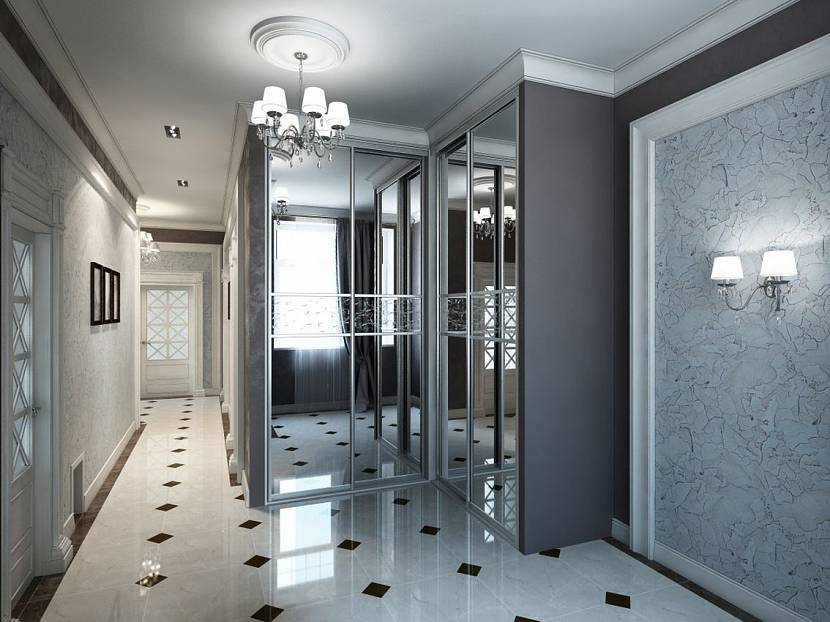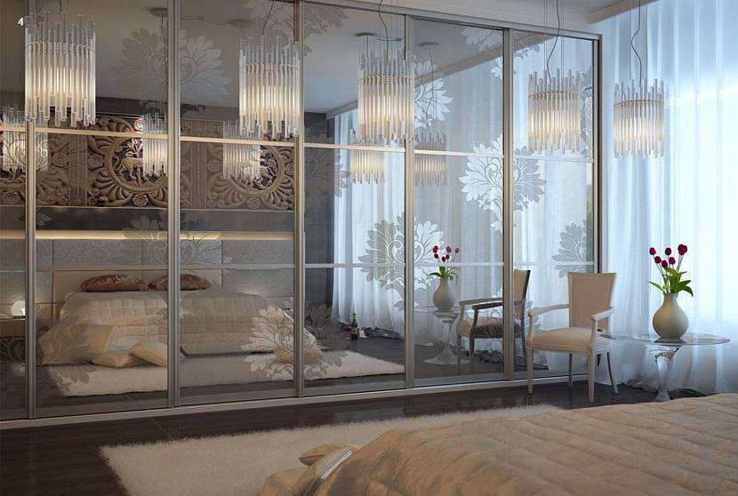 Высоким спросом пользуются шкафы со стеклянными дверцами, позволяющими визуально увеличить пространство. Помимо этого, примеряя наряды, можно разглядеть себя в зеркале, не отходя от шкафа. По краям зеркальной поверхности могут быть нанесены пескоструйные узоры, украшающие дверцы.