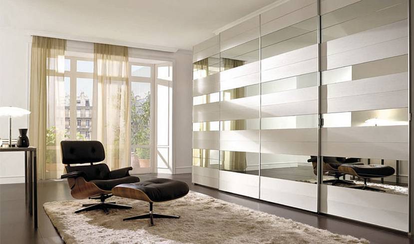 - Зеркальные фасады способствуют визуальному расширению комнаты. Чтобы произвести эффект в маленьких комнатах, многие предпочитают брать длинный шкаф с зеркалом.
