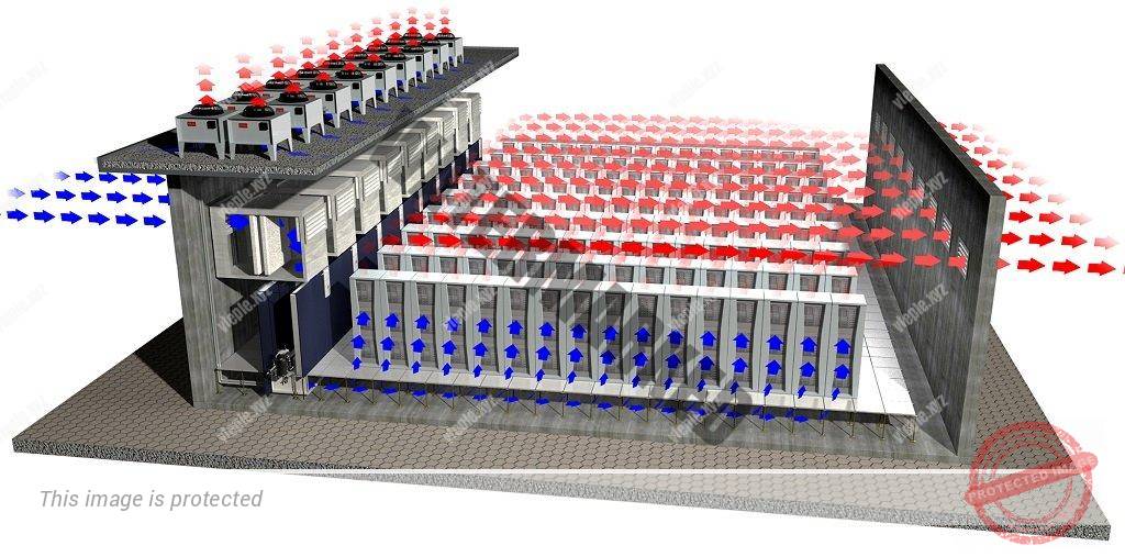 При использовании систем с притоком воздуха (Free Cooling), оборудуется вытяжная вентиляция. Такой способ охлаждения позволяет снизить энергозатраты, если температура на улице меньше той, которую выдает нагретое оборудование. На иллюстрации показан пример со шкафными кондиционерами с внешними блоками.