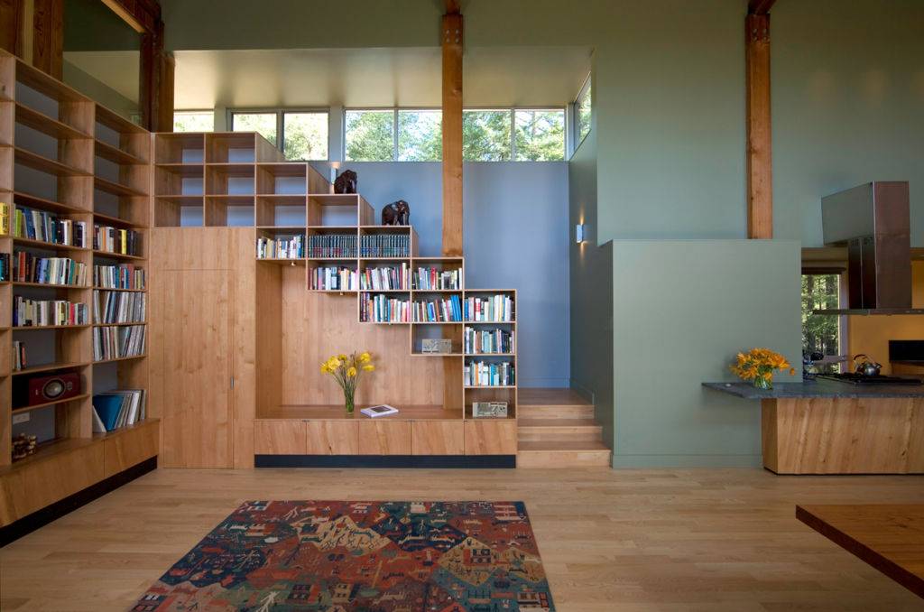 В доме, где есть дети, оригинальным решением станет использование пространства под лестницей для оборудования игровой комнаты. Стеклянная дверь позволит видеть, чем занят маленький ребенок. Игрушки не будут разбросаны по всему дому. Можно присматривать за детьми и заниматься хозяйственными делами.