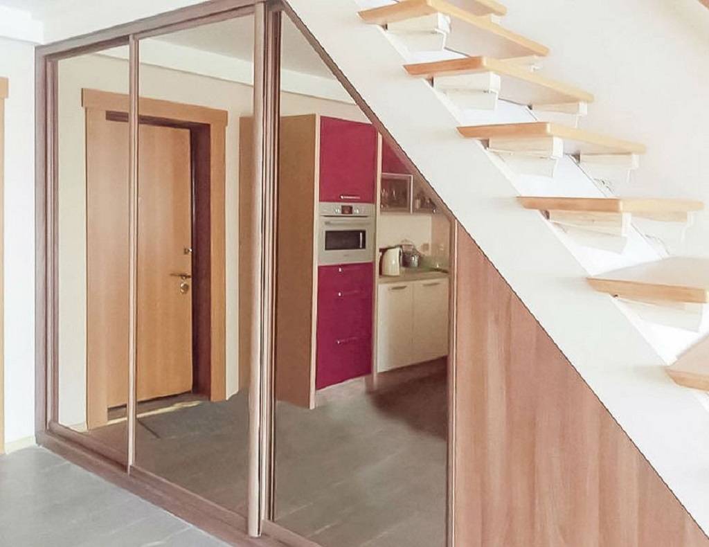 Это неудобно. Шкаф-купе под лестницей устанавливают редко.