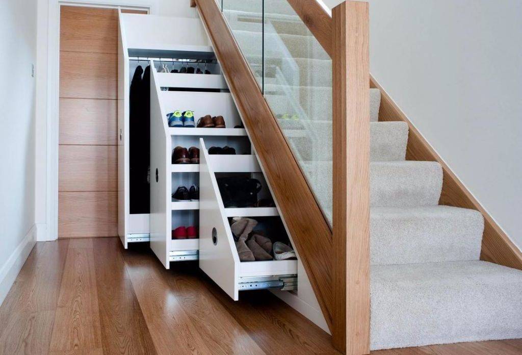 Удобные и функциональные шкафы выдвижного типа. Это могут быть просто ящики разного размера для хранения бытовых мелочей, сезонной одежды, аксессуаров и обуви. Если конструкция лестницы позволяет — ящики оборудуют и в ступенях