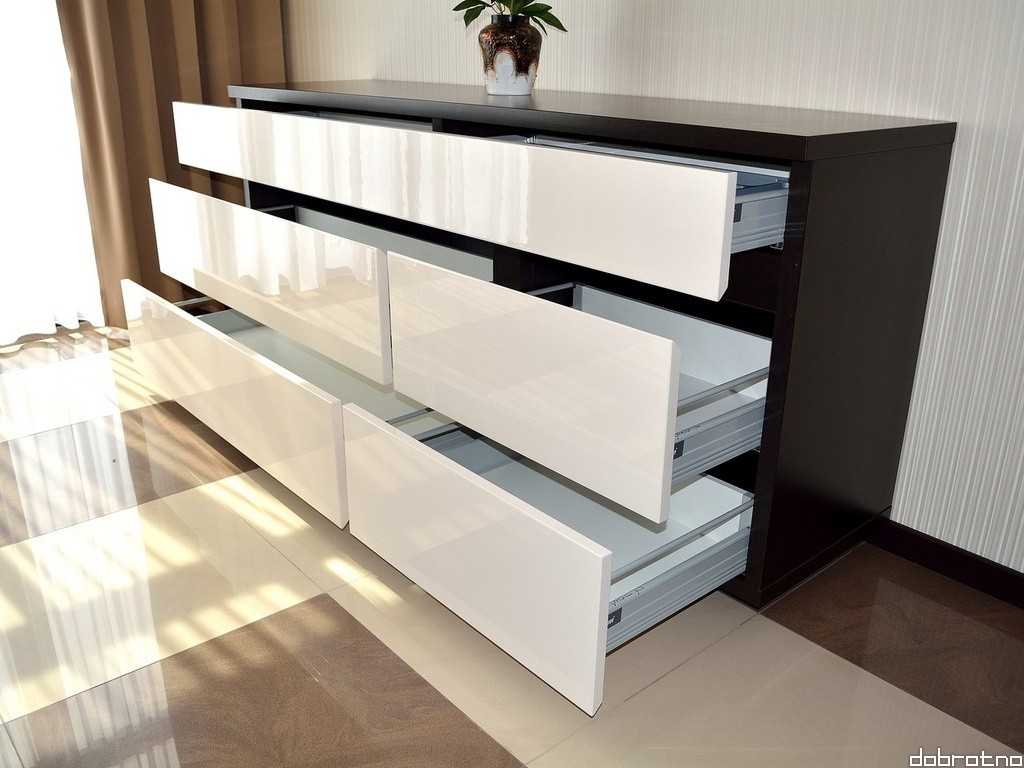 Самая непрактичная вариация – черный глянец. Ухаживать за такой моделью придется постоянно. Любой отпечаток пальца будет портить внешний вид изделия. Покупать такую мебель можно, если есть возможность оплачивать услуги приходящей домработницы или помощника по уборке квартиры.