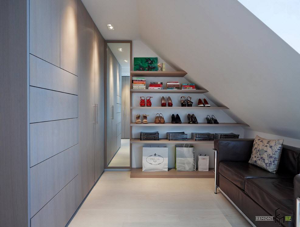 - часто гардеробная на площади мансарды размещается под скатом крыш. Используются как глухие стены для гардеробной комнаты, так и располагается длинный горизонтальный гардероб под окнами. Подобное решение возможно, если высота аттиковой стены достаточна для развешивания верхней одежды. Под скатом крыши можно расположить полноценную гардеробную комнату, если это позволяет ширина помещения. В основном использование для этого аттиковой стены объясняется стремлением занять пространство, не используемое по причине низкой крыши;