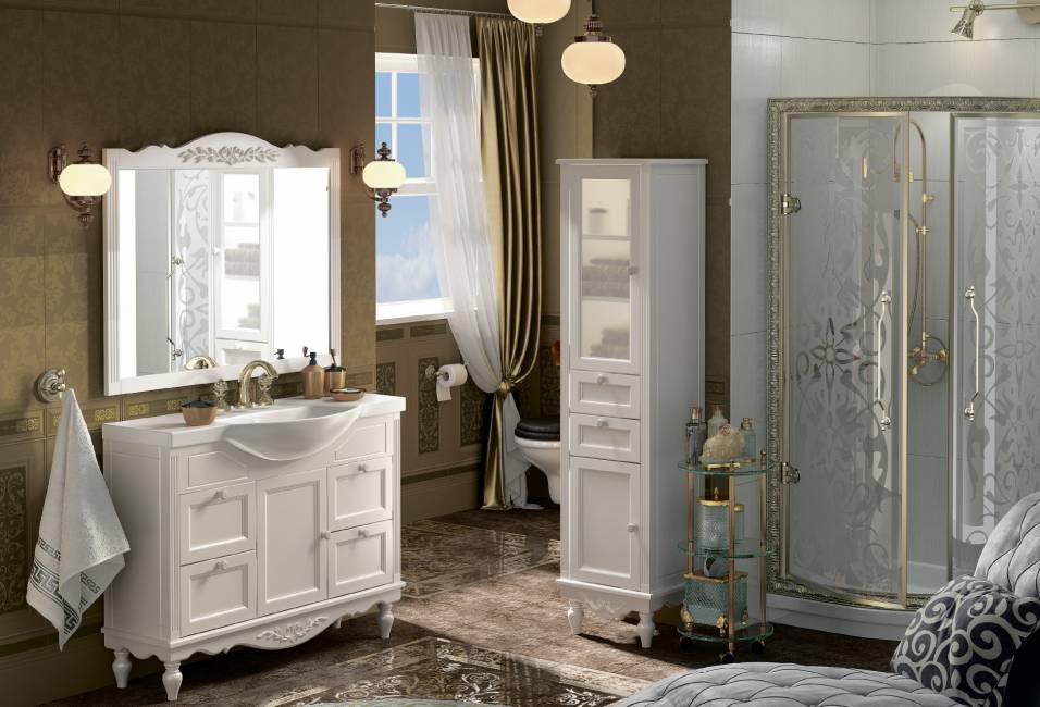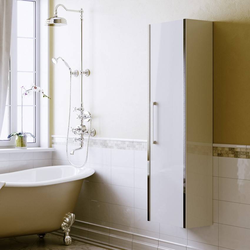 Здесь можно сгруппировать данную мебель по месту, размеру и варианту установки. Есть классический угловой шкаф-пенал, а есть и пристенные образцы. Если во втором случае можно сразу думать о том, как будет выглядеть общая композиция с умывальником и тумбочкой, то в первом — во главу угла ставится экономия места и высокое функционирование.